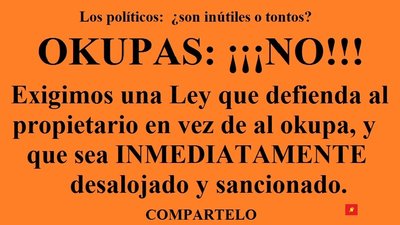 ¿Tiene sentido que tres desarrapados se metan en tu casa y que tardes un par de años en recuperarla? ¿Tiene sentido que si usas la fuerza para echarlos vayas directo a la cárcel, pero que esos desarrapados puedan usar la violencia para meterse en tu casa? ¿Tan inútiles son nuestros políticos que no saben hacer una Ley que impida esta locura?