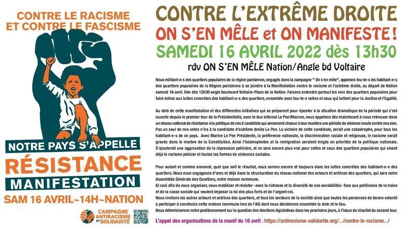 Nous militant-e-s des quartiers populaires de la région parisienne, engagés dans la campagne " On s'en mêle", appelons tou-te-s les habitant-e-s des quartiers populaires de la Région parisienne à se joindre à la Manifestation contre le racisme et l’extrême droite, au départ de Nation samedi 16 avril. Rdv dès 13h30 angle boulevard Voltaire-Place de la Nation. Faisons entendre partout les voix des quartiers populaires pour faire échos aux luttes concrètes des habitant-e-s des quartiers, ensemble avec tou-te-s celles et ceux qui luttent pour la Justice et l’Egalité.