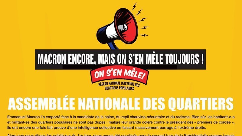 C’est pourquoi le 3ème tour devra être celui d’une accélération de nos luttes, de leur convergence et de la jonction des différents acteurs du mouvement social, ici et maintenant : tout de suite ! Et en parallèle, la campagne des Législatives devra donner voix aux acteurs et actrices de ces luttes. Car comme nous l’avons dit lors de notre appel du 17 mars, la recomposition de la scène politique ne pourra pas se faire sans les acteurs politiques des quartiers.