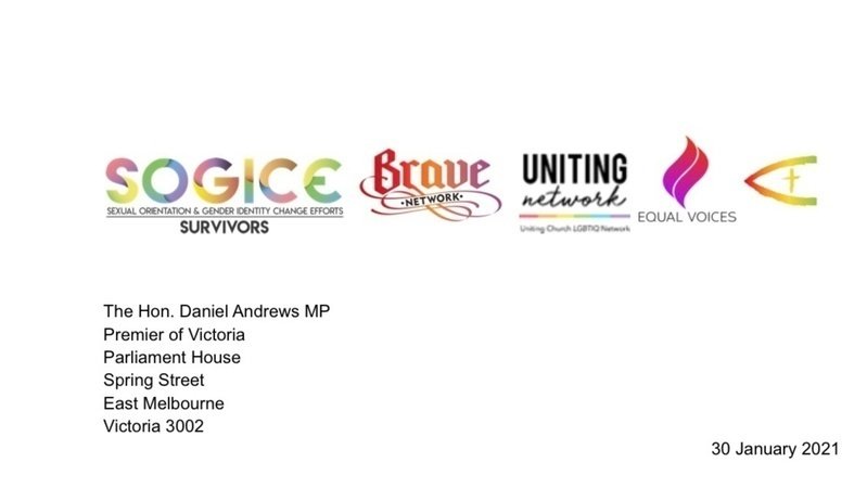 Brave Network, SOGICE Survivors, Equal Voices, Uniting Network and Rainbow Catholics InterAgency for Ministry wrote the attached letter thanking Victoria's Labour Government for its bold support of LGBTQA+ rights. In it, we also respond to concerns raised by conservative groups whose recent letter to the premier of Victoria, advertising and email campaigns have demanded the bill be suspended until it is amended to their satisfaction.