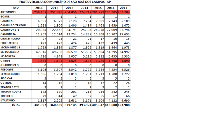 Solicitei ao Detran dados da frota veicular de SJC a partir de 2011. Notem que a frota de automóveis chega a ser 155 vezes superior comparado a frota de ônibus em 2017.