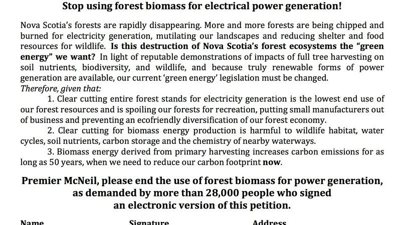 Petition updateStop destroying Nova Scotia's forests for biomass power generationNext step: paper petition to the NS legislature