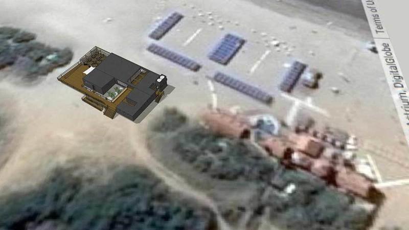 El techo rojo es La Pérgola de 1984. El techo negro es el intruso.
