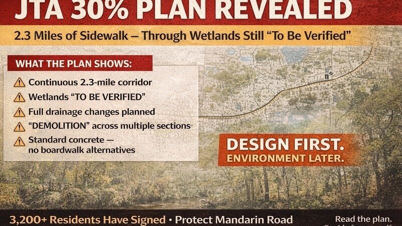We are now adding to this petition a summary of the official JTA 30% design plans for the proposed 2.3-mile Mandarin Road sidewalk. Please email reneeslatercpa@gmail.com for a copy of the design .