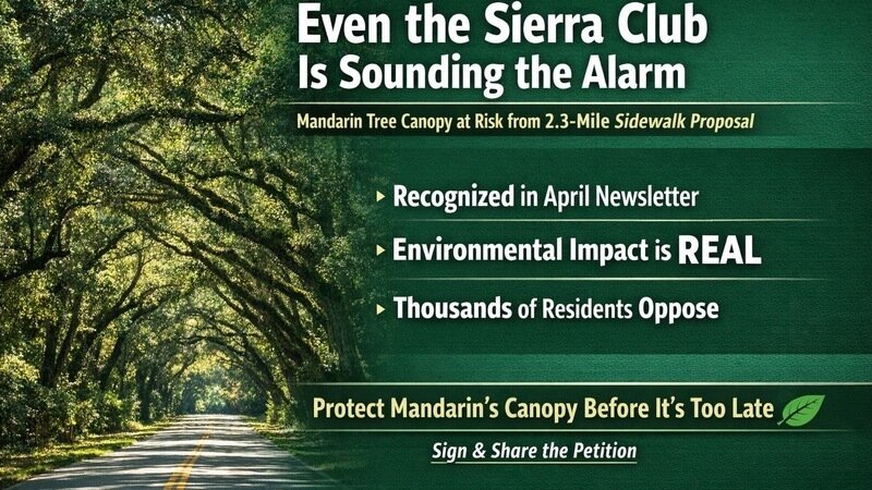 The Northeast Florida chapter of the Sierra Club, in their April newsletter, highlighted the importance of preserving the Mandarin tree canopy and acknowledged the seriousness of the proposed 2.3-mile sidewalk extension along Mandarin Road.