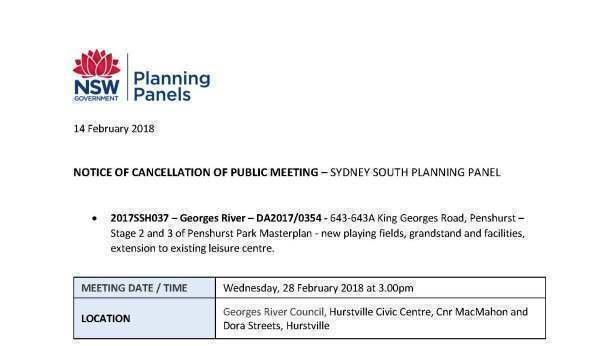 I received an email this afternoon to say that the Sydney South Planning Panel meeting for Penshurst Park on 28-02-2018 has been cancelled !