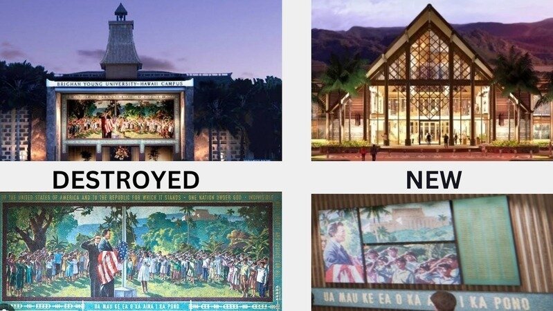 As suspected, the offensive David O. McKay Mosaic is removed. The Administration has been quoted from sources as being offended by the "colonial" injustices displayed in the McKay Mosaic. They were offended by President McKay raising the American Flag. They were offended by the Pledge of Allegiance. They were offended by the children "forced" to salute the American Flag. They were offended by "White Men imperialism" that causes "generational trauma." They were offended because "Hawaii is not part of the USA". (They forget it's not just about them.)