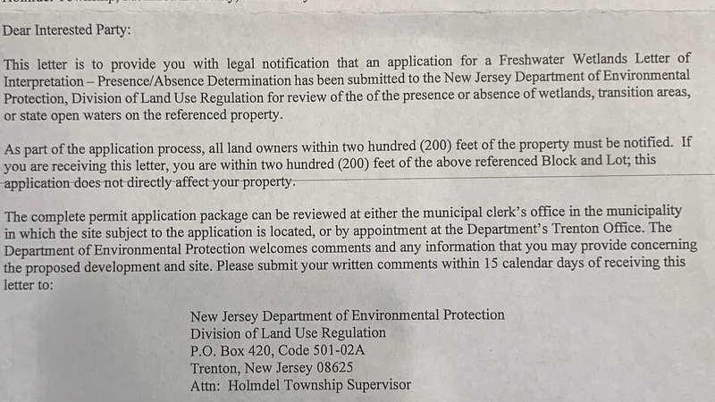 We received this registered letter today. It was mailed before the Holmdel Township Zoning Board meeting regarding the request for a completeness waiver. It states that KIP 20 LLC, via their agents, have filed an application for a “LOI,” or Letter of Interpretation, regarding the presence or absence of sensitive wetlands on within 200 feet of the 125—127 Red Hill Road Property.