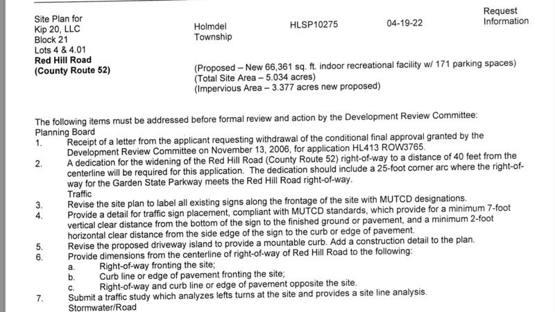 The full document is on our website at https://www.holmdelhoophouse.org/documents, but take a look at item #2 of the response from the County... it states that the development will require the widening of Red Hill Road to 40 feet including a 25 foot "corner arc," which I assume is more commonly known as a "yield lane" for the Garden State Parkway exit.