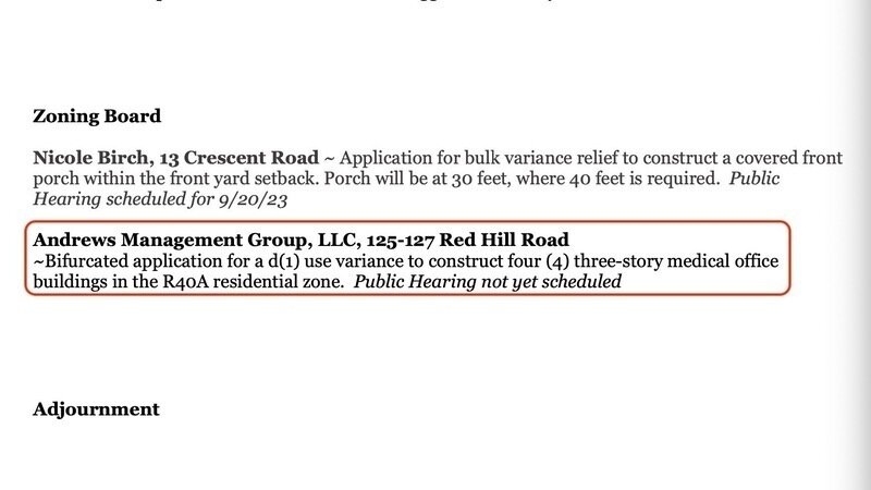 Andrews Management Group, LLC, a company registered with the State of New Jersey on 06/20/2023 has filed an application with Holmdel Planning Board to construct four three story office buildings at 125-127 Red Hill Road. This company was organized by Andrew Piscatelli for the express purpose of creating this development on what is zoned Agricultural-Residential Land. I do hope Mr. Piscatelli did not purchase this property from KIP 20 LLC on the assumption that this was a 5.2 acre commercially zoned lot — because it is not. (Late breaking news: we heard from the Planning Board that the property is still owned by KIP 20.)