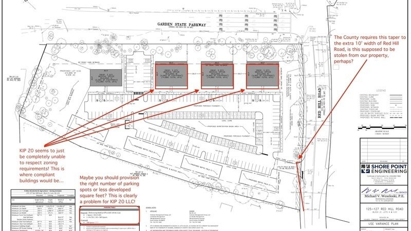 - Talking of parking, the plan notes that a building this size should provide 365 parking spaces, but only 198 are planned. KIP 20 and Andrews will therefore need the Township to completely ignore these commercial planning requirements. Insufficient parking was also a feature of the prior Holmdel Hoop House plan. Do KIP 20 LLC not realized that their property is in New Jersey where everybody drives a car?
