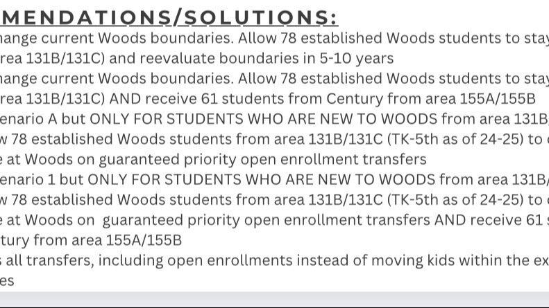 - Adopt Scenario 1 but ONLY FOR STUDENTS WHO ARE NEW TO WOODS from area 131B/131C AND allow 78 established Woods students from area 131B/131C (TK-5th as of 24-25) to complete 6th grade at Woods onguaranteed priority open enrollment transfers AND receive 61 students from Century from area 155A/155B