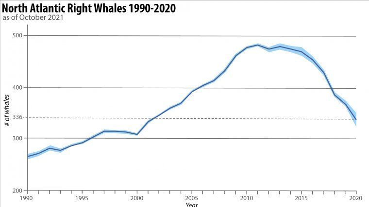 "...The North Atlantic Right Whale Consortium announced that the North Atlantic right whale population dropped to 336 in 2020, an eight percent decrease from 2019. The newly released estimate for the critically endangered species is the lowest number in nearly 20 years." (https://www.neaq.org/about-us/news-media/press-kit/press-releases/population-of-north-atlantic-right-whales-continues-its-downward-trajectory/