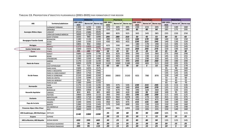 Les propositions d’objectifs régionaux pluriannuels par ARS, par subdivision et par formation se déclinent selon un effectif cible, arrondi au multiple de 5 le plus proche, et des bornes à minimum +/- 5 % de la cible, pour chaque filière (Tableau). En italique-gras sont renseignés les objectifs régionaux de professionnels à former, partiellement ou entièrement formés hors territoire. En effet, tous les territoires n’ont pas d’UFR dans chacune des filières. C’est donc au sein d’UFR d’autres territoires que sont formés les étudiants. Par exemple, les étudiants en pharmacie issus de Saint-Etienne, qui ne dispose pas de faculté de pharmacie, sont formés à Lyon. Cette situation est encore plus fréquemment rencontrée pour l’odontologie.