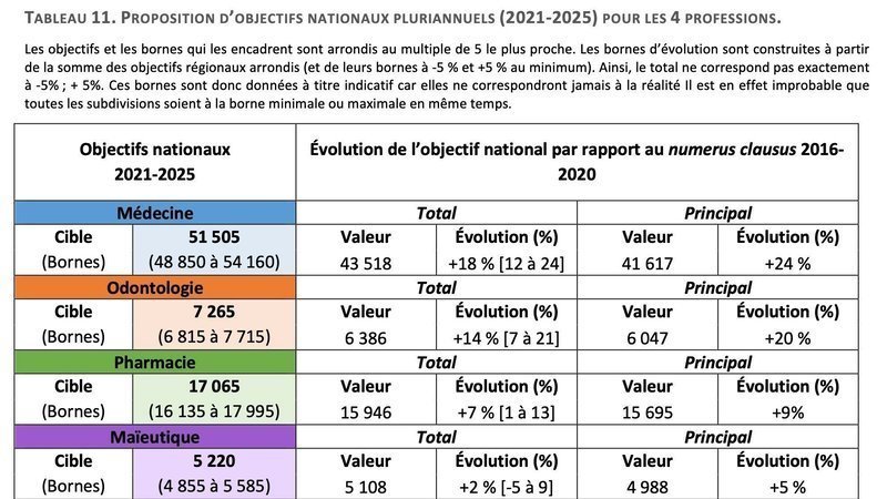 Dans tous les cas, des mesures de suivi sont indispensables pour anticiper les évolutions et préparer les objectifs quinquennaux futurs. Trois professions nécessitent une réévaluation des objectifs avant cinq ans : celles des médecins pour mieux prendre en compte les impacts de l’augmentation déjà engagée depuis 20 ans sur la densité, celle des sages-femmes pour mieux prendre en compte l’impact de la mutation de leur métier et celle des chirurgiens-dentistes pour vérifier l'adaptation des capacités de formation à l'objectif.