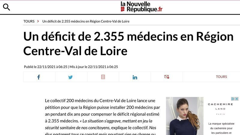 La Nouvelle République informe la région de l'existence de notre pétition pour lutter contre le déficit de 2.355 médecins en région Centre-Val de Loire dans cet article.