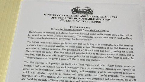 2 The MFMR wishes the general public to know that the facility to be constructed is a Fish Harbour not a Fish Mill as portrayed by the social media writers. The objective of the Fish Harbour is to centralise fishing activities. The government of Sierra Leone has been yearning for a Fish Harbour since the early 1970s, but could not actualise it due to the huge amount of money that is required. With the new shift in government policy for the development of the fisheries sector, the Chinese government has given a grant of $55m to build this platform.