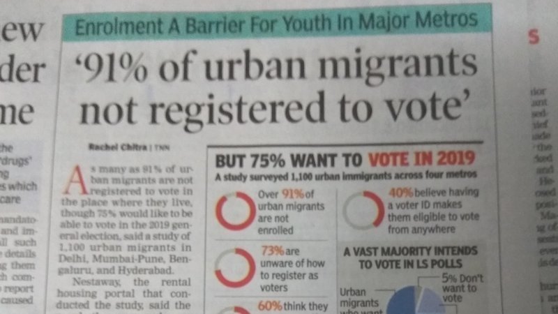 As per News about 91 % of Urban migrants not able to vote as the process of enrollment at shifted place is very painful and complicated...