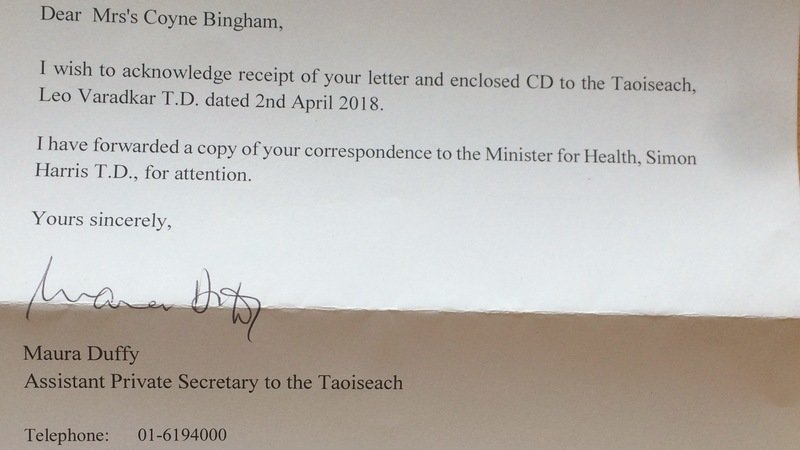 We got another acknowledgement in the mail today from Maura Duffy, Assistant Private Secretary to an Taoiseach Leo Varadkar. Again, it has been directed to Simon Harris, Minister for Health.