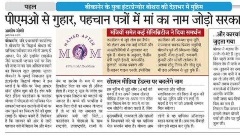 Mise à jour sur la pétitionMothers Name As Middle Name By Default In Govt. Issued Identity DocumentsNamed After Mom Campaign In News