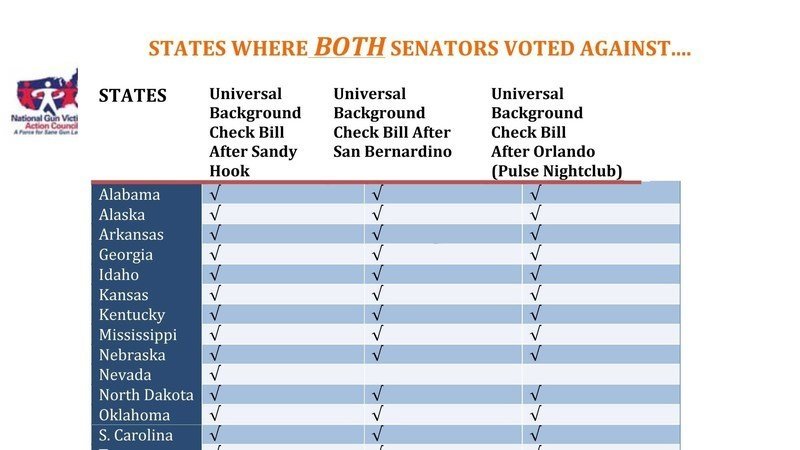 (See chart below). As can be seen in the chart, after the Sandy Hook massacre in 2012, both Senators in 17 states voted against Universal Background Checks (UBCs)––a background check for every gun sold. After the San Bernardino shooting in 2015, that number jumped to both Senators in 20 states voting against UBCs. And after the 2016 Orlando Pulse nightclub shooting––the deadliest shooting in U.S. history before Las Vegas––the number jumped to both Senators in 23 states voting against UBCs. That represents a 35 percent increase of federal lawmakers hostile to gun safety laws since Sandy Hook.