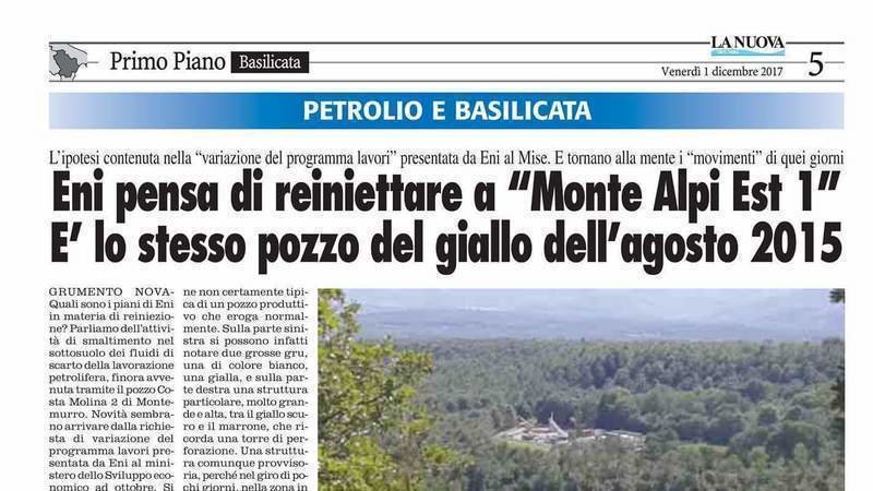 Mentre il Presidente della Regione Marcello Pittella rassicura sulla notizia dell'aggiornamento richiesto da ENI del programma dei lavori in Basilicata, si scopre che il cane a 6 zampe vuole effettuare le operazioni di reignezione dei fluidi di scarto nel pozzo Monte Al'pi Est 1, dopo la chiusura di Costa Molina.