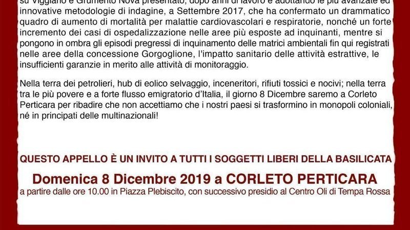 ti segnalo che domenica c'e una manifestazione a Corleto (PZ) contro l'estrazioni petrolifere. Nell'allegato maggiori informazioni.