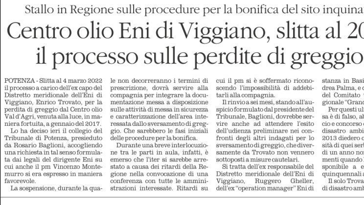 Petition updateFermiamo i pozzi di petrolio in BasilicataCentro oli Eni di Viggiano, slitta il processo sulle perdite di greggio