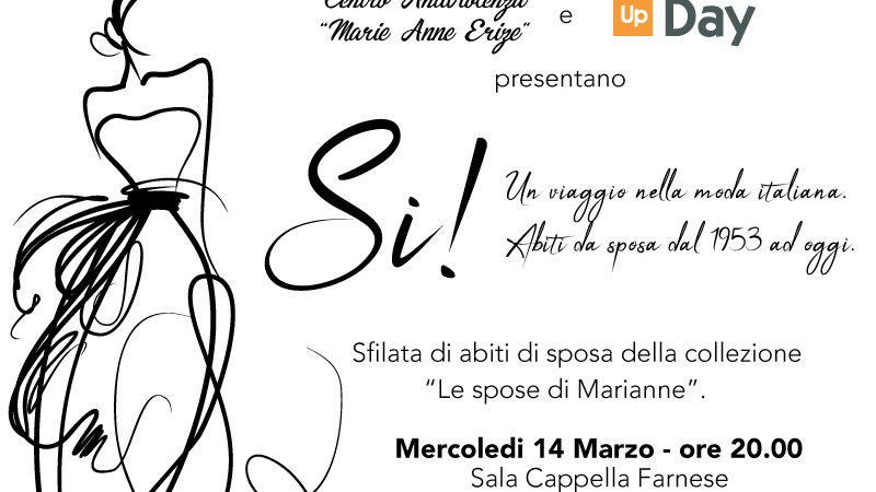 Si! Un viaggio nella moda italiana che abbraccia stili e tendenze per riflettere abitudini, usi e costumi. E' questo l'obiettivo della sfilata organizzata dal centro antiviolenza "Marie Anne Erize" e dalla Fondazione UP-Day, che si svolgerà a Bologna, presso la Cappella Farnese nella serata di mercoledì 14 marzo alle ore 20.