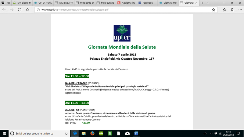 Sabato 7 aprile, nell'ambito delle iniziative per la 70° Giornata mondiale della salute, saremo presenti da Upter Università Popolare di Roma con un workshop di due ore, che si terrà dalle 11 alle 13, dal titolo: SENZA PAURA. CONOSCERE, RICONOSCERE E DIFENDERSI DALLA VIOLENZA DI GENERE.