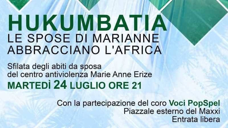 Venti indossatrici, tra le quali giornaliste, donne impegnate nel sociale e in politica, per indossare abiti da sposa storici della collezione del Centro Antiviolenza Marie Anne Erize; abiti che vanno dal 1920 ad oggi, ognuno con una storia, a volte triste, che viene raccontata uscita per uscita; le voci di un coro e una performance di danza orientale: tutto questo è HUKUMBATIA (in italiano abbracci) la sfilata in programma martedì 24 luglio alle ore 21.00 sulla Piazza del MAXXI (ingresso libero).