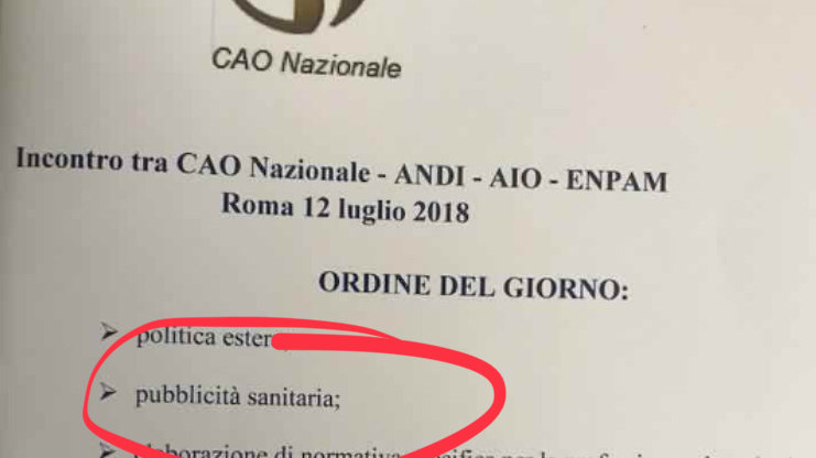 Convocata riunione congiunta di tutte le più importanti sigle istituzionali e sindacali dell'odontoiatria. Abbiamo posto il problema della pubblicità tra le emergenze della professione. Chiediamo norme eque, rispettose della deontologia medica, eguali per tutti e non discriminanti per nessuno, a tutela dri pazienti e degli operatori. FUORI GLI IMBROGLIONI E GLI SPACCIATORI DI ILLUSIONI DAL MONDO ODONTOIATRICO E MEDICO.