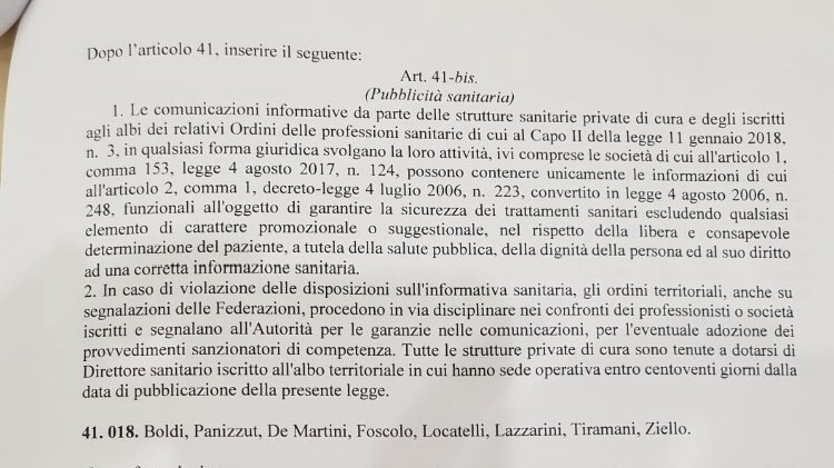 La nuova norma sul contrasto alla pubblicità sanitaria ingannevole è frutto di un compromesso parlamentare tra le istanze della libera professione e le esigenze dell’odontoiatria commerciale . In generale passa l’enunciazione di principio circa l’obbligo di non promuovere e suggestionare i cittadini ma informare correttamente, cosa che la Petizione Triestino ha da sempre richiesto. La legge rimanda alla Bersani per tutto il resto. Completano la norma la possibilità di interventi ordinistici a posteriori , ricorso all’Agcom e non all’Agcm, Direttori Sanitari del luogo dove ha sede operativa la struttura, richiamo alle loro responsabilità ... un indicazione di buon senso che solo in Italia deve essere codificate per legge. MEGLIO QUESTO CHE NULLA ED È TROPPO PRESTO PER CAPIRE SE FUNZIONERÀ . Al momento le tv, le radio ed il web sono pieni di pubblicità .