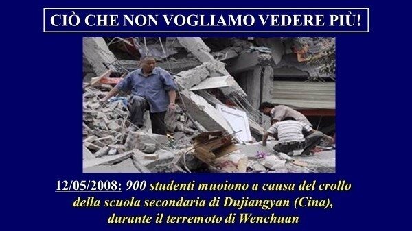 In Italia, giustamente, piangiamo ancora i 27 bambini e la loro maestra uccisi dal crollo della loro scuola elementare Francesco Jovine a San Giuliano di Puglia (anche a causa della sua scellerata sopraelevazione), durante il terremoto del Molise e della Puglia del 31 ottobre 2002, ma, sia noi che i nostri politici, non ci rendiamo conto che potrebbe accadere anche di molto di peggio, se, a causa di un prossimo terremoto violento da qualche parte nel nostro Paese e delle nostre gravi carenze in materia di prevenzione sismica, crollasse una scuola più grande e con un numero molto maggiore di studenti rispetto alla Francesco Jovine (ove i bambini, fortunatamente, erano solo 58)?