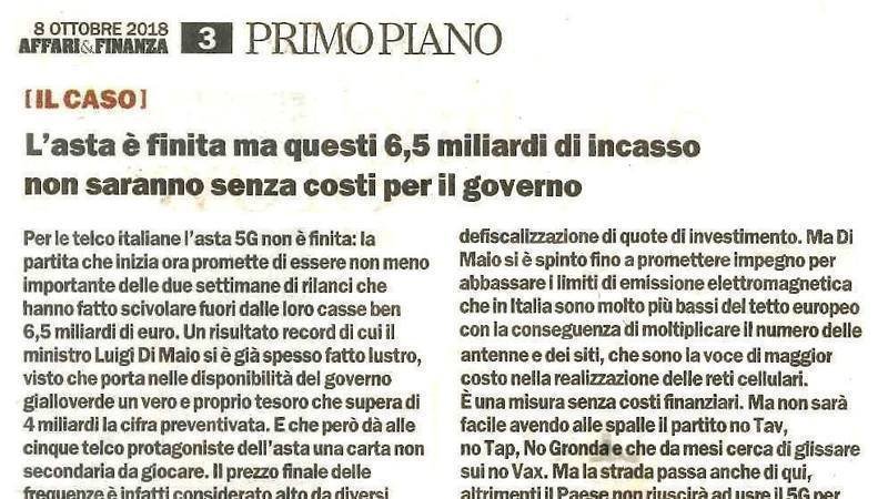 "Ma Di Maio si è spinto fino a promettere impegno per abbassare i limiti di emissione elettromagnetica, che in Italia sono molto più bassi del tetto europeo con la conseguenza di moltiplicare il numero delle antenne e dei siti, che sono la voce di maggior costo nella realizzazione delle reti cellulari"