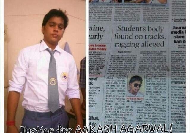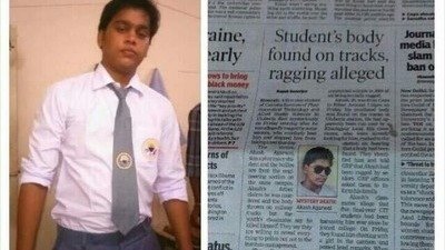 The victim, Akash Agarwal, was a pharmacy student and the bullies are from the engineering section on the same campus. Akash's father claims he was murdered and the body thrown on railway tracks but the youth's classmates say he killed himself. They say they are willing to reveal everything to police but not to the institute management.