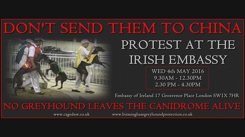 Petition updateStop export of Irish greyhounds to their deaths in ChinaRally at Irish Embassy on May 4