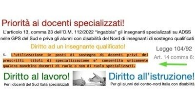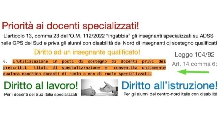 Gli insegnanti specializzati nel sostegno si trovano invece intrappolati nelle proprie province senza possibilità di insegnare nel resto d'Italia a causa dell'OM112/22 art 13 comma 23.