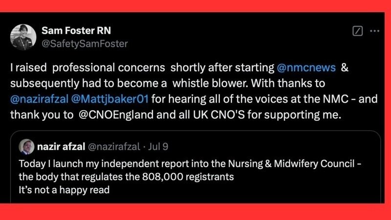 Sam Foster publicly whistleblew at the NMC shortly after joining as their Executive Nurse Director of Professional Practice at the NMC. We are now told that she I"s away from work at the moment."