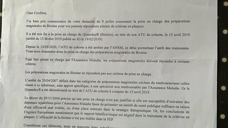 Petition updateSclérose en plaques : Un traitement ! Mais il est non remboursé et retiré du marché !Réponse de la sécurité sociale