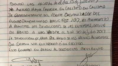 Por estas razones, los asistentes se organizaron para exigir un reembolso y fue así como el pasado 15 de Julio, siendo las 16:10 hrs, el representante del comité organizador del evento denominado "Magic Fest" (Arturo Maya Cabrera) firmó un acuerdo donde se compromete a hacer la devolución del total del costo de las entradas al evento a más tardar el día 20 de Julio de 2017, devolución que siendo hoy 3 de agosto de 2017 no se ha efectuado.