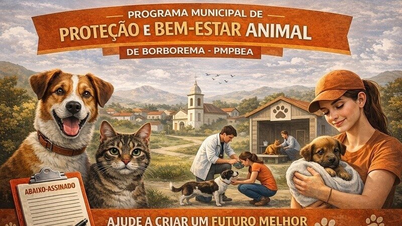 Nós, cidadãos de Borborema, estamos unidos por uma causa importante e necessária: a criação do Programa Municipal de Proteção e Bem-Estar Animal de Borborema (PMPBEA). Sabemos que já existem esforços e ações voltadas à causa animal em nosso município, e reconhecemos sua importância. No entanto, muitos cães e gatos em situação de abandono ainda enfrentam fome, doenças e reprodução descontrolada, enquanto cidadãos sensibilizados contribuem de forma voluntária e, muitas vezes, informal para amenizar essa realidade. Nosso objetivo é colaborar com o município no fortalecimento e na estruturação de uma política pública progressiva, que inclua acolhimento temporário, castração, atendimento veterinário e ações de prevenção e conscientização. Ao assinar este abaixo-assinado, você apoia uma iniciativa que busca somar esforços, promover o bem-estar animal e contribuir para uma cidade mais organizada, consciente e humanitária para todos.