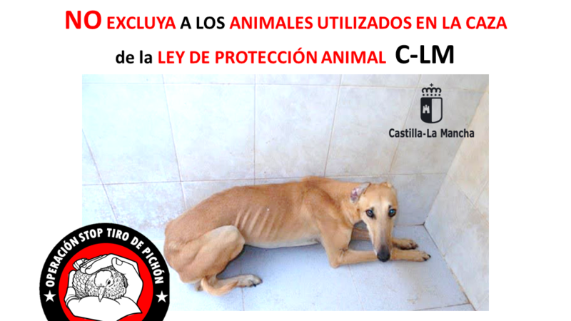 El #lobbyCaza de Casatilla-La Mancha (C-LM, España) presiona al Gobierno y a la Consejería para que no aplique la futura nueva Ley de Bienestar Animal de C-LM (proyecto de Ley de Bienestar, Protección y Defensa de los animales) a los animales que participen en actividades cinegéticas, así como que se elimine la esterilización obligatoria de las perreras deportivas, jaurías y rehalas.