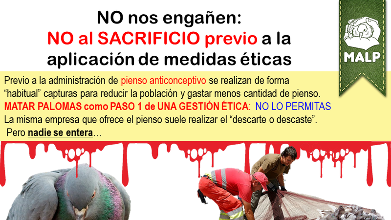 EXPLICACION: cuando una ciudad va a aplicar pienso anticonceptivo, todos los ciudadanos son felices. Pensamos que se van a instalar las tolvas y controlarse la población eticamente. Sin embargo, el primer paso es MATAR un buen número, y ya con la ´´limpieza´´ del exceso, aplicar pienso anticonceptivo a las afortunadas que no son matadas en este paso 1. después se supone que se controla al resto de población con el pienso, sin captura y sacrificio. el tema es, quien sabia que se realiza la matanza previa en el mismo contrato que se firma la admistración del pienso? eso es, que en un método ético, sólo sino capturas y matas palomas ni al principio, ni durante ni nunca. si capturas y matas, pues es ético para la prensa, pero no para el mundo real pues se están sacrificando palomas y nadie se entera pues se supone que con las tolvas de pienso anticonceptivo ya no se captura ni mata.