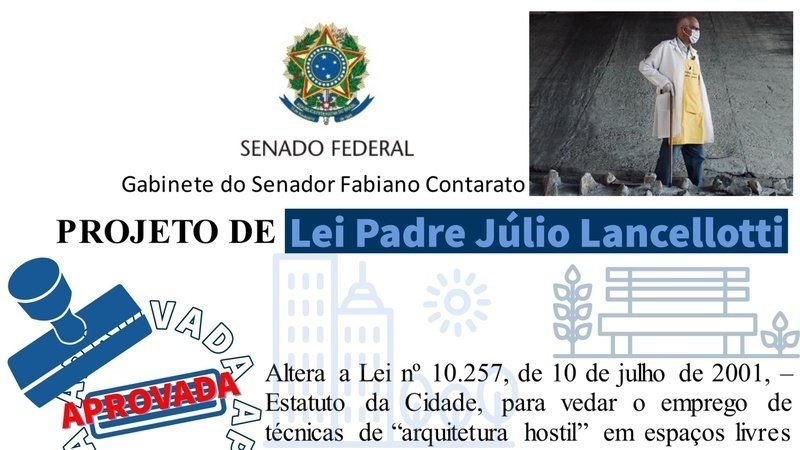 Foi aprovado no Senado Federal em 05 de abril de 2021 A LEI PADRE JÚLIO LANCELLOTTI, o Projeto de Lei no 488 de 2021, do Senador Fabiano Contarato, que altera o Estatuto da Cidade, para vedar o emprego de técnicas de “arquitetura hostil” em espaços livres de uso público.