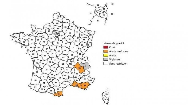 À ce jour, le 22 février 2023, 4 départements sont concernés par une restriction au-delà de la vigilance sur au moins une partie du territoire : l'Isère, le Var, les Bouches-du-Rhône et les Pyrénées-Orientales. La Savoie est au niveau de vigilance.