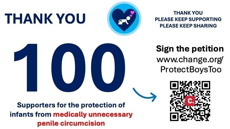 We've now reached 100 signatures for the protection of infants from medically unnecessary genital surgery. Thank you for being one of those 100 (and counting!).