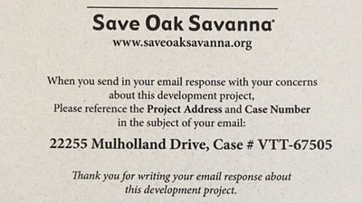 We are also asking for everyone to please contact Milenia Zasadzien who is the city planner and councilman Bob Blumenfield to voice your concern about this development. Please make your calls to them at (213)847-3636. You can also email Milenia at milena.zasadzien@lacity.org and Bob at council member.blumenfield@lacityorg. If you do email them please include in the title the case name and number which is 22255 Mulholland Dr case #VTT-67505. If you would want to send them letters in the mail you can send them to: 221 N Figueroa St, Suite 1350, Los Angeles Ca 90012.