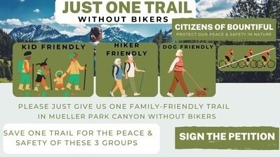 Our initial concern was to protect hikers with JUST ONE TRAIL in Mueller Canyon, but as we reviewed the intricate bike system being built in our mountains, and the elimination of hiker trails, we decided we need to focus on protecting our natural spaces for the future generations.