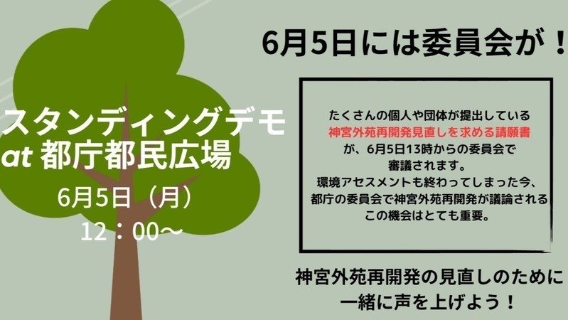 Today (June 5th) at 1:00 p.m., the Environment and Construction Committee of the Tokyo Metropolitan Assembly will discuss official requests submitted by many individuals and groups that are asking for a rethink of the Jingu Gaien redevelopment.